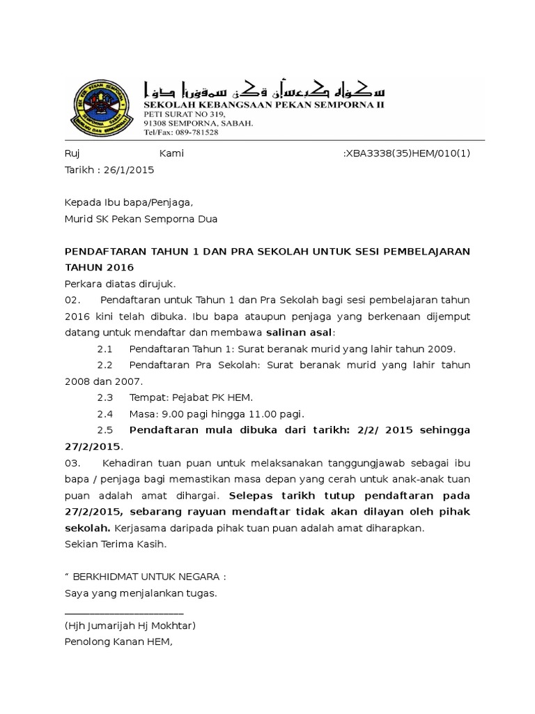 Surat Jemputan Pendaftaran T1 Dan Pra Utk Thun 2016 Pdf